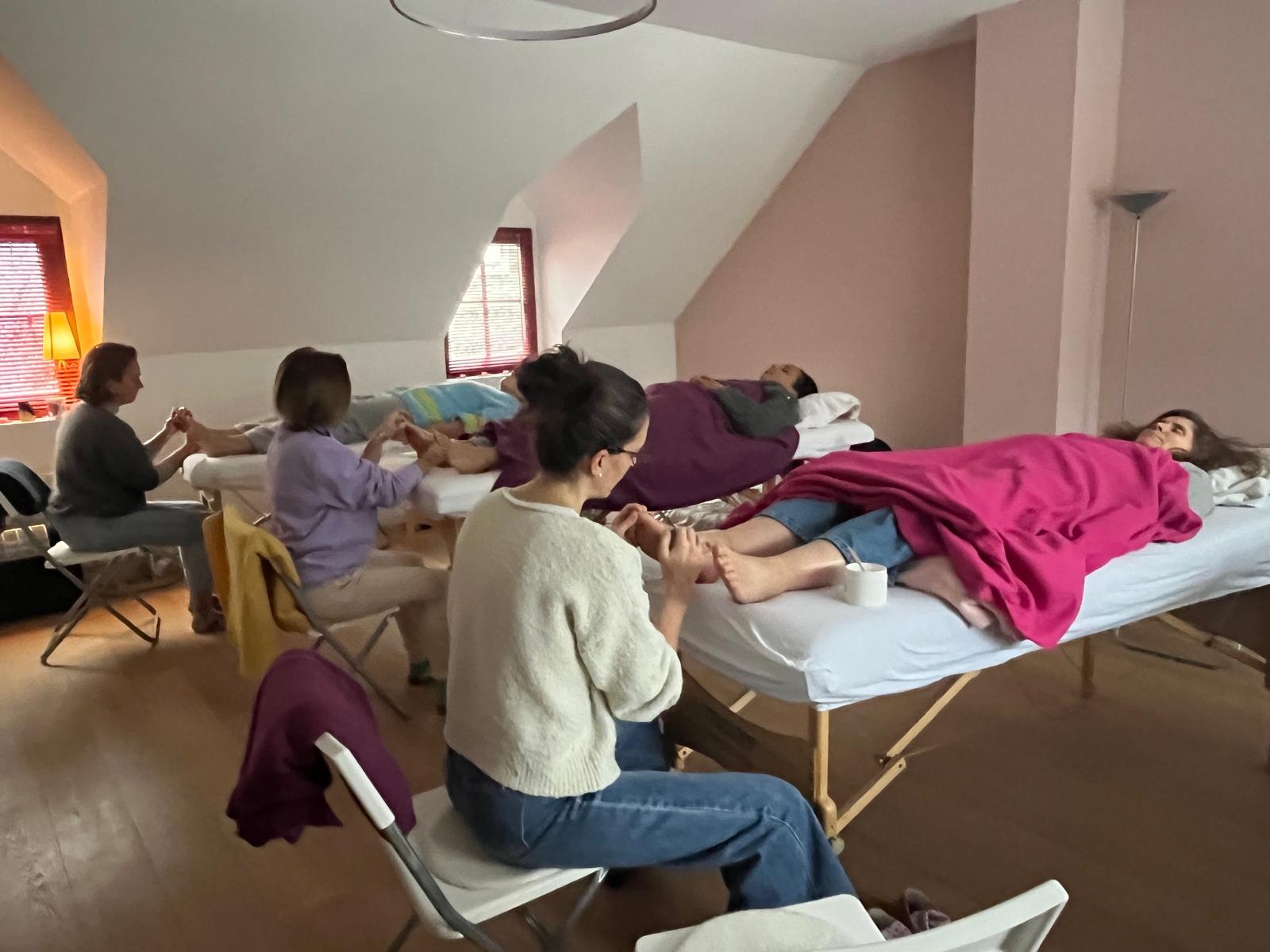 Le massage se pratique habillé et est destiné à tous, il n’a pas de contre-indications, il peut se faire pendant la grossesse, sur des personnes dans le comas, en fin de vie, en chaise roulante, alitées…il faut juste avoir accès aux pieds, aux mains et à la tête.